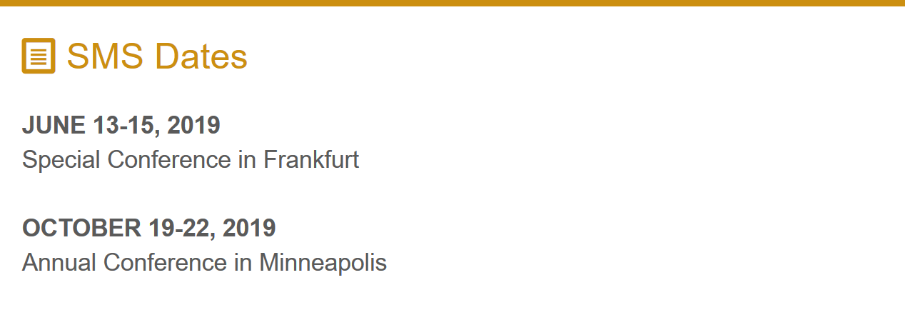 DATES Januari 21,2020 : Submmission Deadline for proposals for SMS Special Conference in Hangzhou February 21, 2020: Submission Deadline forproposal for SMS Annual Conferencein London March